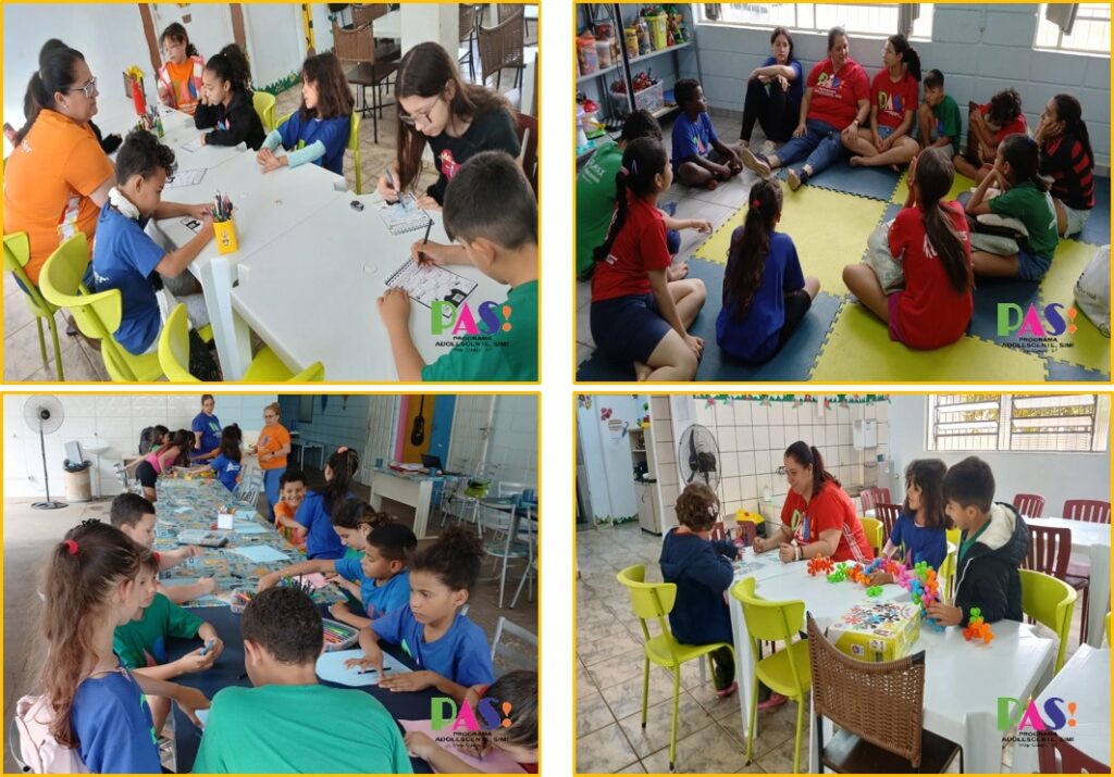 A formação de valores e a construção de bons caráteres acontecem de maneira acolhedora e transformadora no PAS!. A interação, a boa conversa e o acompanhamento cuidadoso fazem parte das Oficinas Socioeducativas, que estimulam a convivência saudável em grupo e fortalecem vínculos. Essa ação é conduzida com dedicação pelas educadoras sociais Delcy Gomes e Carol Morais, com o apoio essencial da diretora Alice Cirilo e das técnicas Adriana Hass (psicóloga) e Vanderleia Antonio (assistente social). No planejamento, a coordenação pedagógica de Maria Luiza Martini garante a excelência das atividades. Uma equipe comprometida com o que o PAS! acredita e promove: amor às crianças, paciência e esperança em cada passo do desenvolvimento.